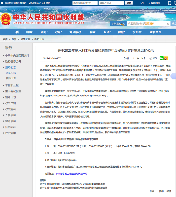近日,湖北華旭檢測有限公司傳來喜訊:經國家水利部公示,公司水利工程質量檢測混凝土工程類和巖土工程類兩項專業(yè),順利通過甲級資質認定公示期。